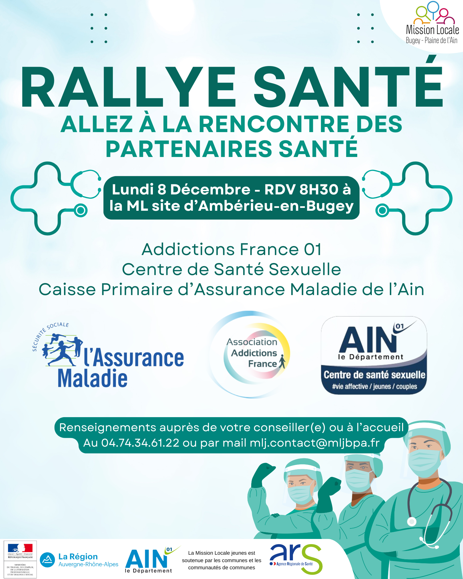 🩺RALLYE SANTÉ 👨⚕️Venez rencontrer nos partenaires santé : Addictions France 01, CPEF, CPAM de l'Ain 📅Le Jeudi 8 Décembre à 8H30 à la Mission Locale d'Ambérieu. ❓Renseignements et inscription auprès de votre conseiller(e) Mission Locale ou à l'accueil au 04.74.34.61.22