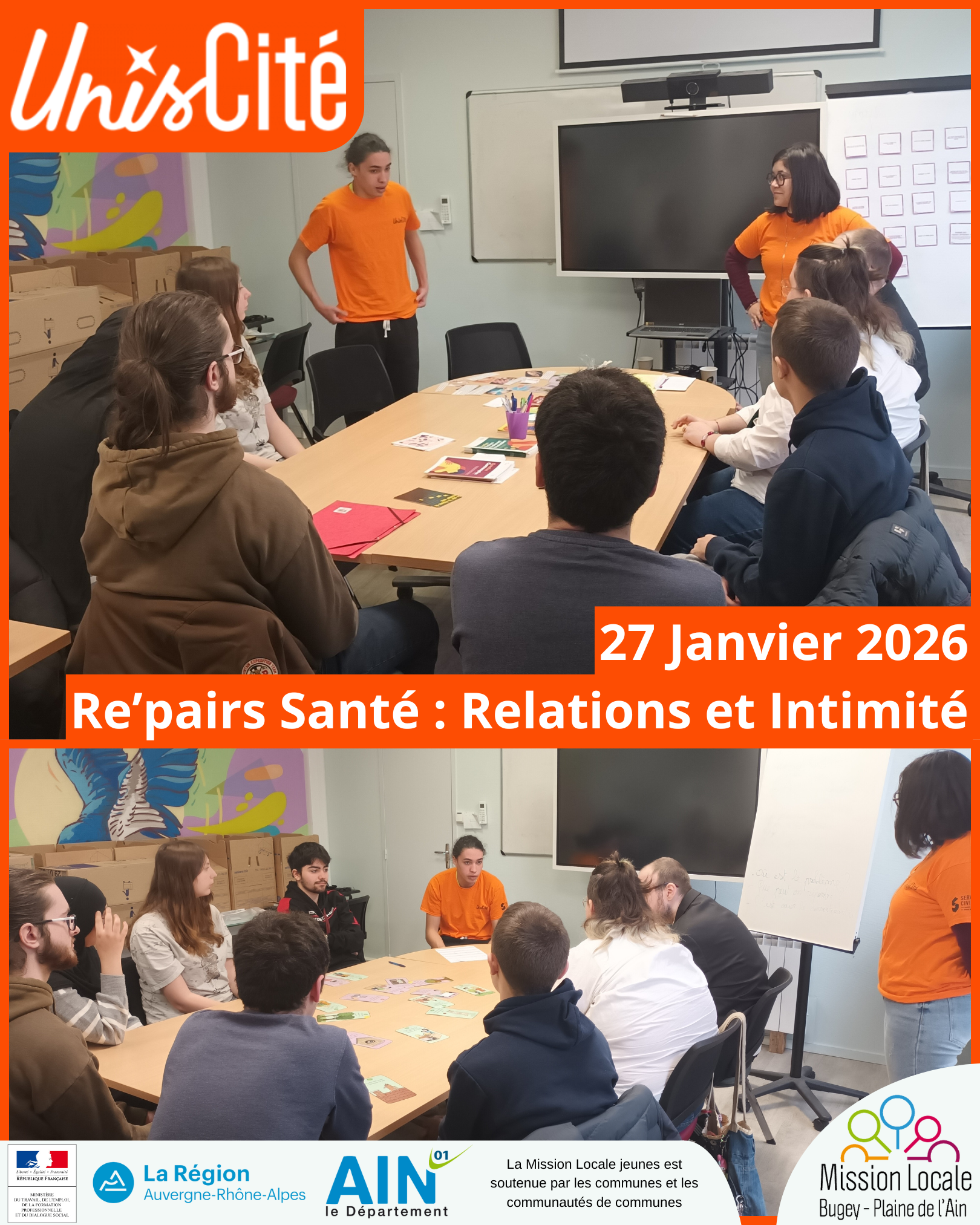 Ce Mardi 27 Janvier, des jeunes en Service Civique d'Unis-Cité Bourg-en-Bresse sont intervenu auprès des jeunes de la Mission Locale pour parler santé et échanger sur les thématiques "Relations et intimité". D'autres thématiques seront abordées jusqu'au mois de Mai au rythme d'un atelier par mois.